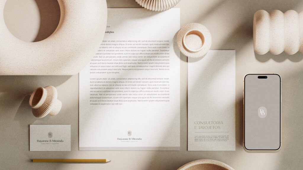 Desenvolvimento do logotipo e da identidade visual da Dayanne B. Miranda Consultoria e Projetos, buscando transmitir elegância, seriedade e profissionalismo. A escolha de tipografias geométricas e leves reforça a modernidade e clareza, enquanto a paleta em tons de bege e verde escuro transmite sobriedade e confiança. O projeto foi pensado para criar uma identidade visual equilibrada, que reflita competência, credibilidade.