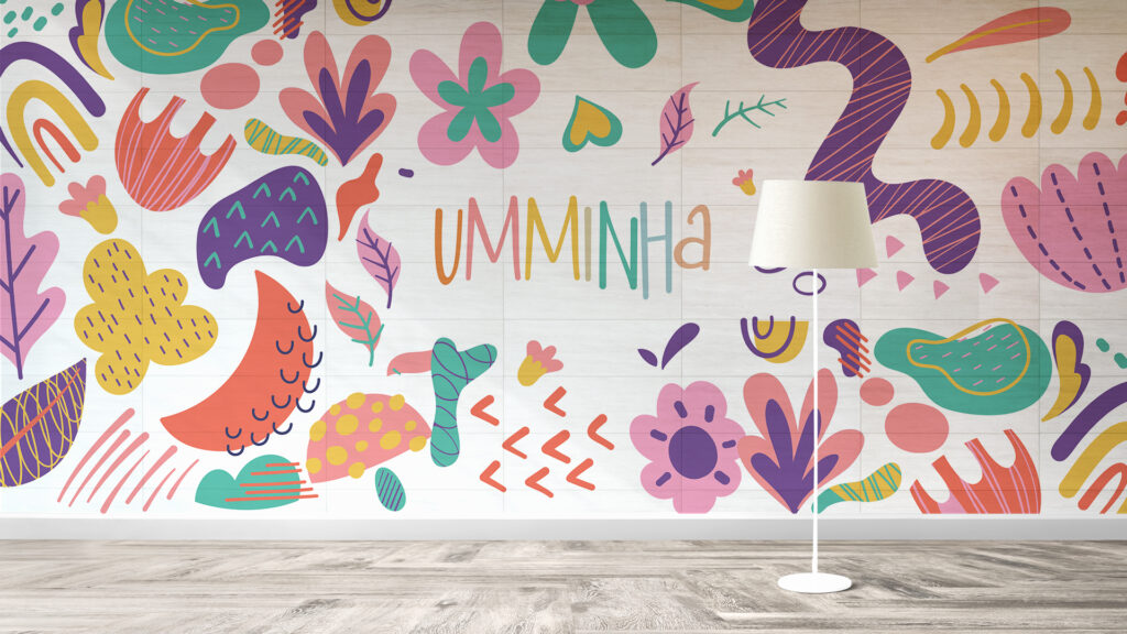 Desenvolvimento do logotipo e da identidade visual da marca Umminha, voltada para o público infantojuvenil. Com base nessa identidade, foi criada uma ilustração personalizada para aplicação na parede da loja, explorando cores vibrantes e tipografia lúdica. O projeto buscou transmitir a personalidade da marca, gerar impacto visual e criar um ambiente acolhedor e envolvente, capaz de atrair e encantar crianças e adolescentes, fortalecendo a presença da marca no espaço físico.