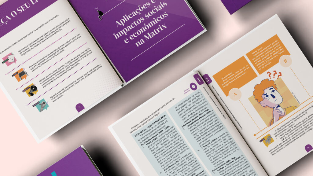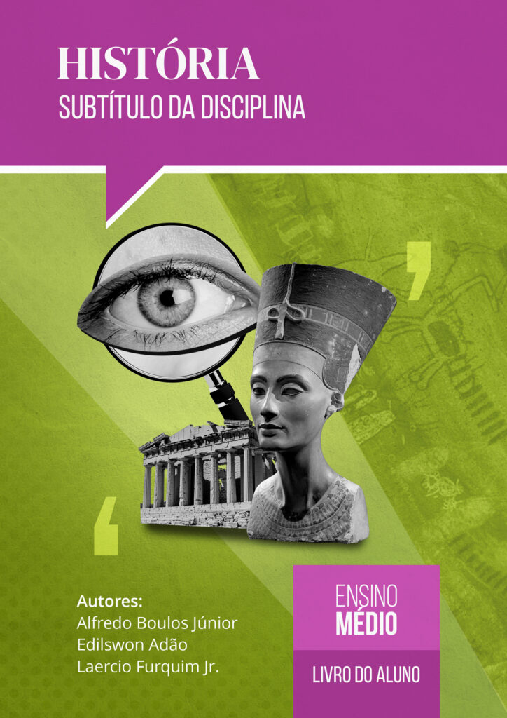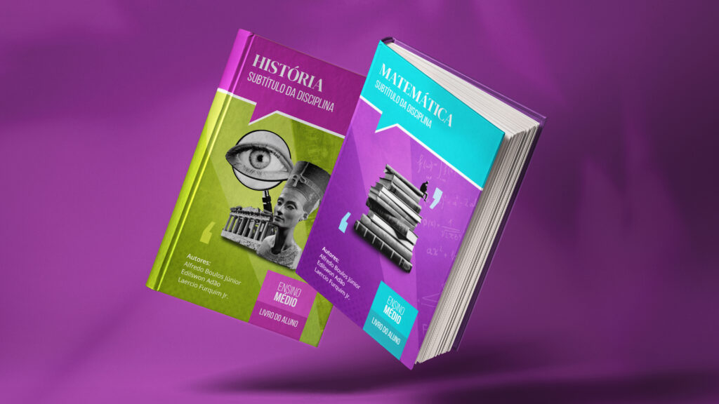 Desenvolvimento de duas propostas de capa para o PNLD Ensino Médio 2024, inspiradas em colagens que contrastam preto e branco com cores vibrantes da identidade visual. Cada capa apresenta um fundo composto por imagens e a colagem central que remetem ao tema da disciplina. Também foram criados ícones para o projeto gráfico, garantindo consistência visual e reforçando a linguagem do material. A combinação de cores, contrastes e elementos visuais foi pensada para despertar a curiosidade e engajar os jovens leitores, criando uma experiência acolhedora, dinâmica e inspiradora desde o primeiro contato com o material.