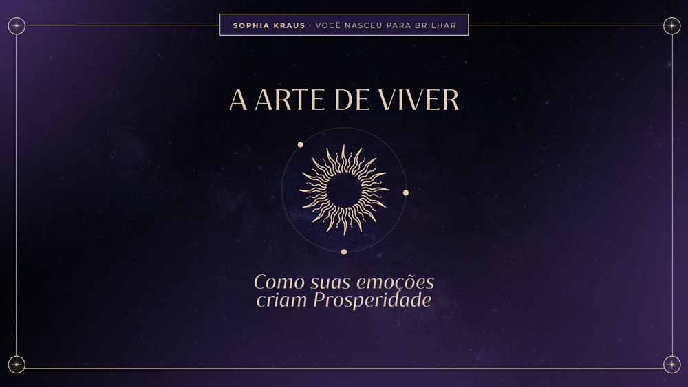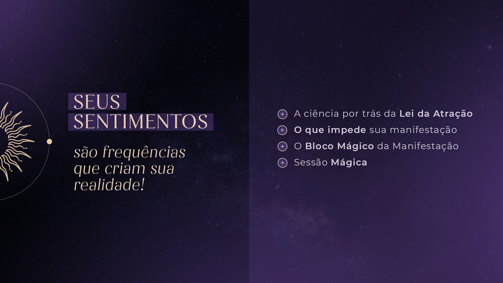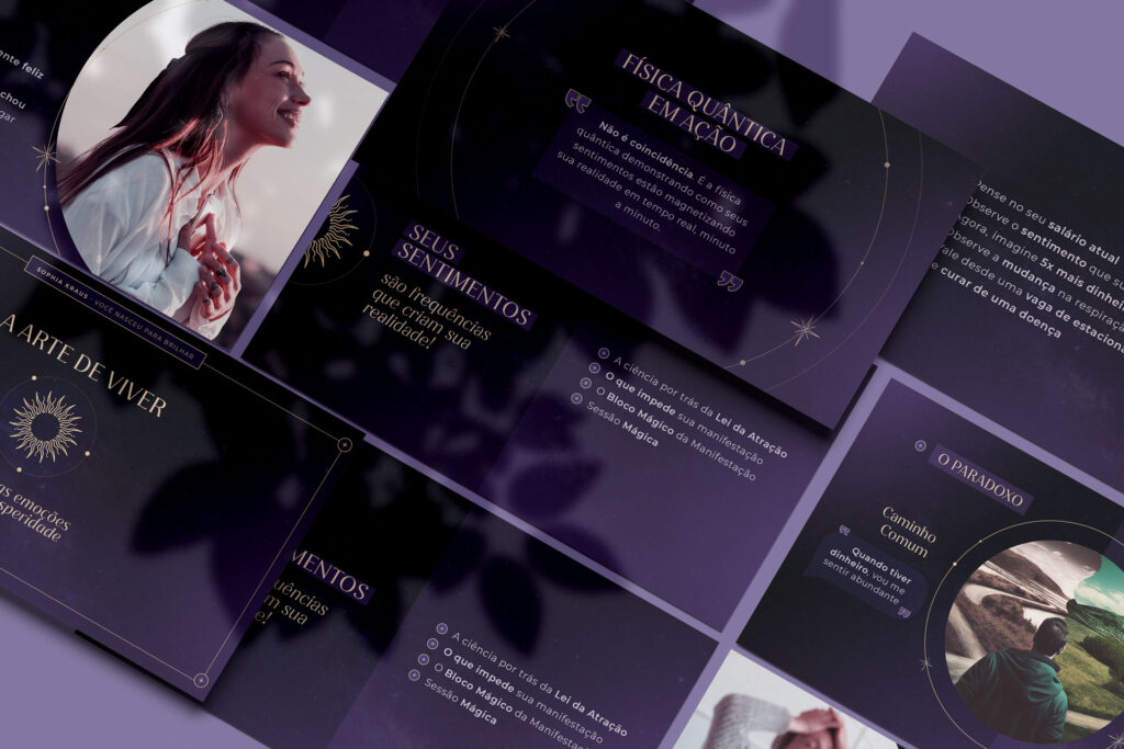 A identidade visual dos slides das palestras de Sophia Kraus foi desenvolvida para criar uma atmosfera envolvente e sensorial, alinhada à proposta dos conteúdos apresentados. O projeto utilizou referências do universo, estrelas e elementos simbólicos, construindo uma estética mística e contemplativa. A paleta de cores profundas, aliada a texturas sutis e elementos gráficos delicados, contribui para uma comunicação visual impactante, elegante e coesa. O resultado é um material que valoriza a experiência visual da palestra, reforça a mensagem transmitida e cria um ambiente imersivo para o público.